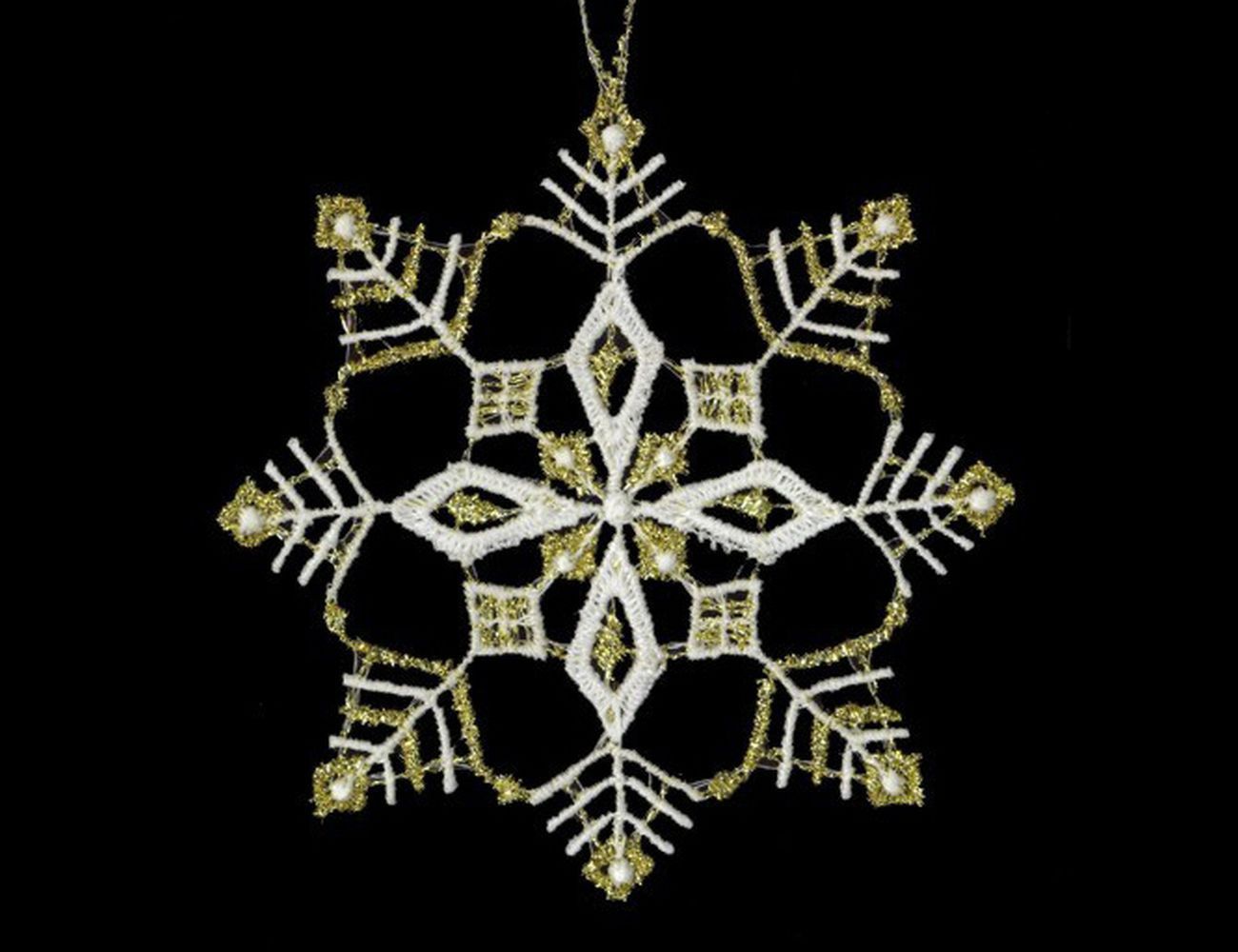 Ажурная, нежная белозолотая снежинка ИРМАЛИНДА из плауэнского кружева подарит уют, радость и волшебство Рождества. Нет, не так! Настоящее Рождественское чудо! К тому же с богатой историей! Плауэн, Саксония. Родина плауэнских кружев. С 15 века в городе развивается ткачество, затем белошвейное мастерство и плетение кружев. В 1900 году Плауэн получает Гранпри на Всемирной выставке кружев в Париже. Затем были сложные периоды кризисов, но кружевное чудо не пропало, не закончилось в мировых катаклизмах. Чудо сохранилось, и в 1994 году был зарегистрирован официальный бренд плауэнских кружев. Всё, чтобы у вас случилось чудо.