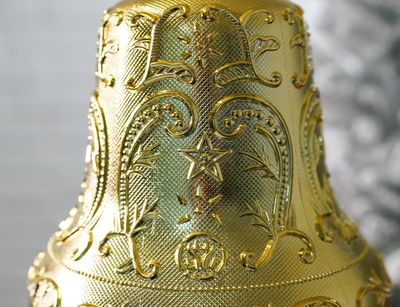 Традиционно-любимым украшением новогодней ели и праздничного интерьера всегда остаются колокольчики. Изысканностью формы колокольчики подчеркивают торжество и красоту новогоднего дерева. А рельеф этого необычного золотого колокольчика напоминает, к тому же, о знаменитых русских промыслах и народных сказках. Такие колокольчики просто незаменимы, если вам нужно нарядить большую ёлку как в помещении, так и на улице! Красивые, лёгкие, небьющиеся, прекрасно гармонирующие с другими украшениями - всё, что нужно для того, чтобы с удовольствием создавать эффектный праздничный декор!