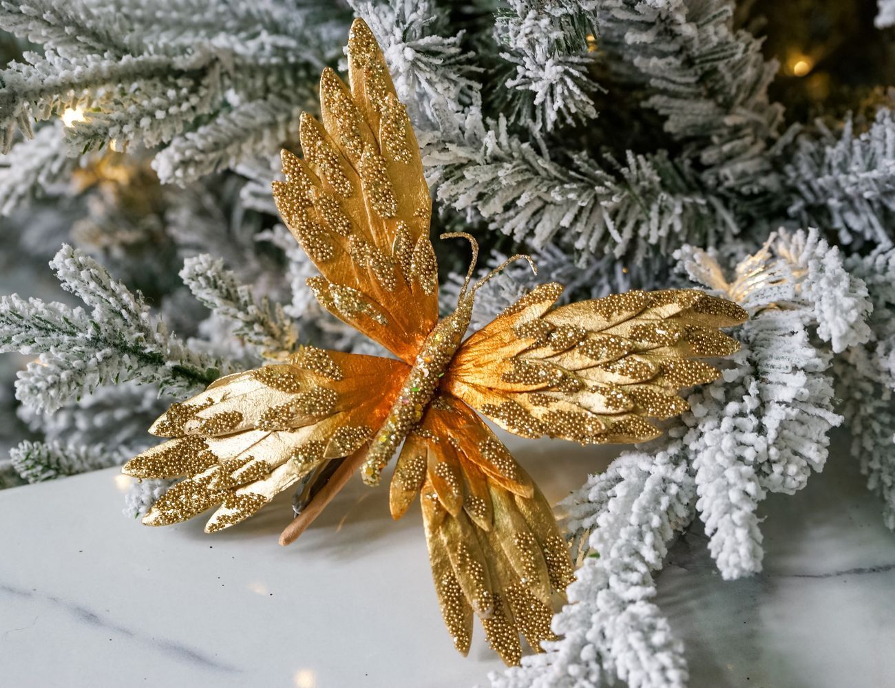 Бабочка на ёлке? Зимой, среди снегов и морозов?! А вот представьте, что такое чудо вполне возможно: прекрасная золотистая бабочка, чьи крылышки напоминают прекрасные крылья архангелов, украсит собою торжество! С помощью удобной клипсы усадите бабочку на подходящее место и она не упорхнёт прочь, а с радостью составит компанию и будет весело мерцать золотистыми блёстками для вас и ваших гостей!
