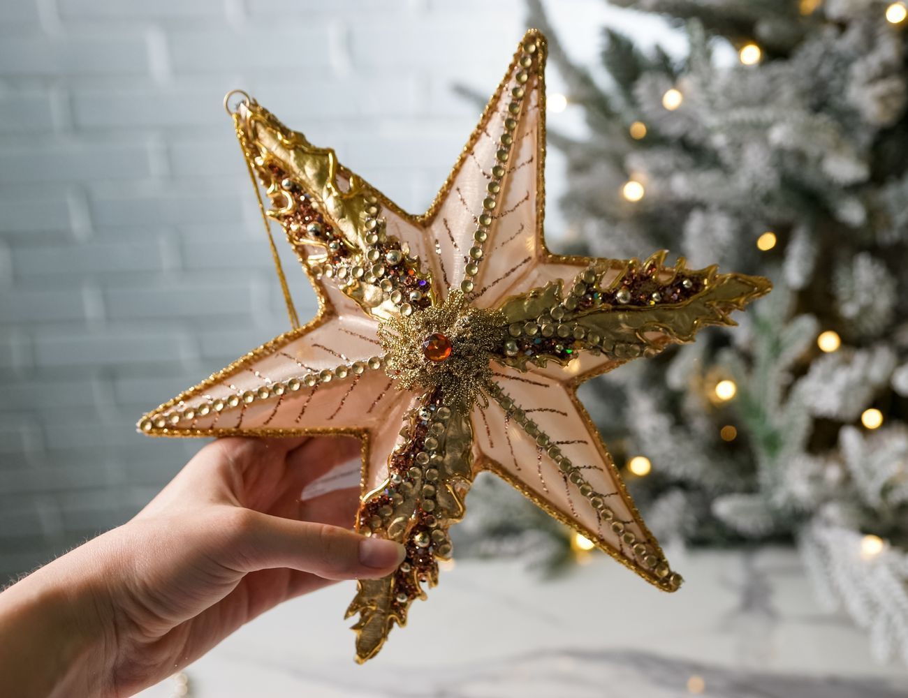Большая звезда не в виде наконечника, а среди игрушек, скорее редкость — она притягивает к себе внимание и размером, и блеском. Рекомендуем для декора больших помещений и крупных ёлок, где данное украшение будет смотреться гармонично и эффектно.