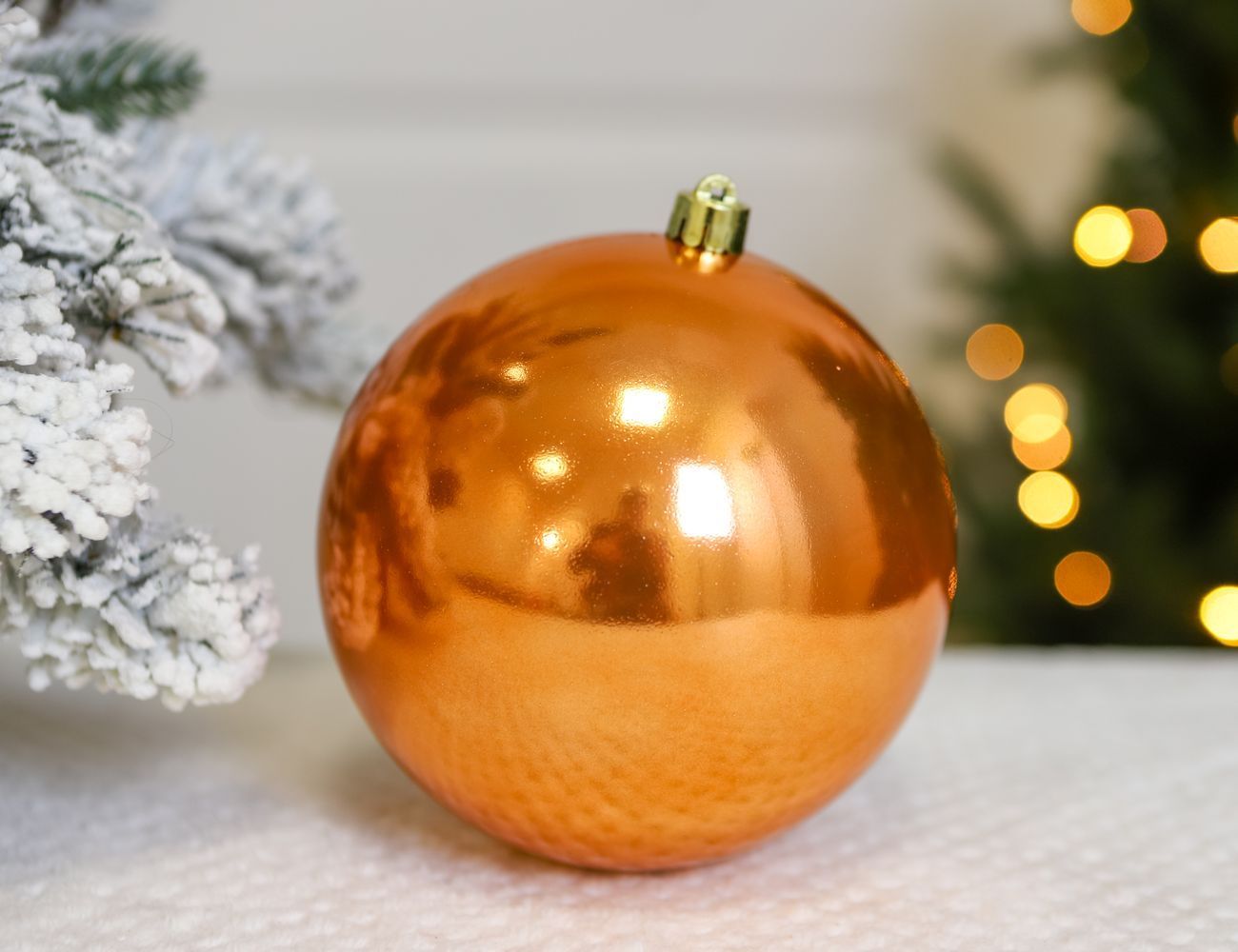 Крупный глянцевый шар оттенка пряной тыквы. Такие шары идеально подходят для оформления искусственных и натуральных елей на улице и в помещениях.