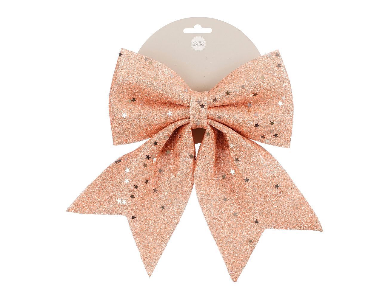 Бант - одно из самых элегантных и изысканных, красивых и традиционных праздничных украшений! Искрящийся россыпью маленьких звёздочек, крупный персиковый бант будет как великолепным ёлочным, так и прекрасным интерьерным украшением, а его мягкое сияние будет неизменно очаровывать и привлекать взгляды!