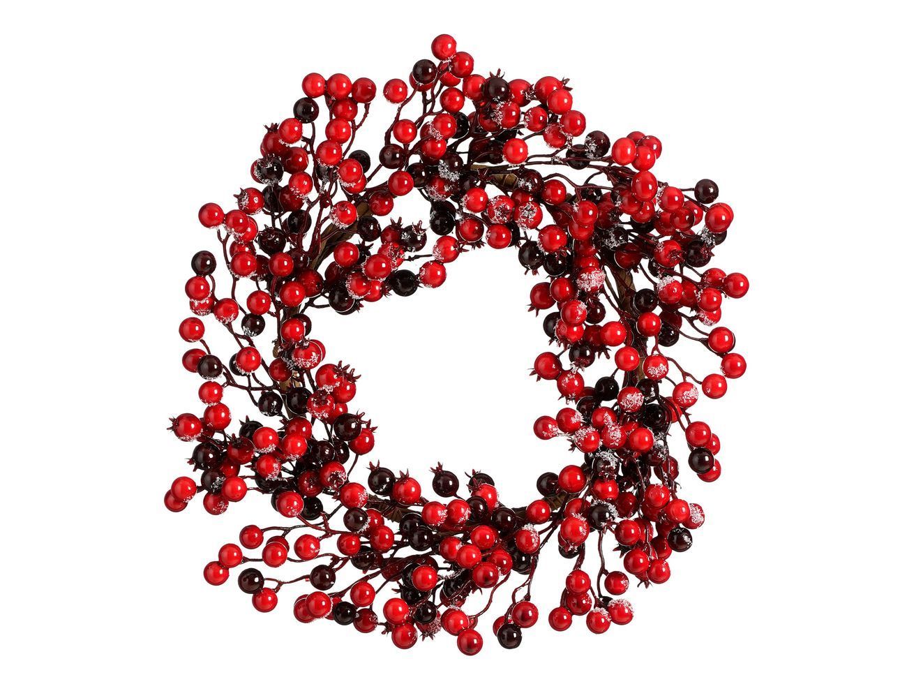 Алые и бордовые, такие глянцевые и чуть подмёрзшие: кажется, чуть надави пальцами на любую ягоду и брызнет сладкий ароматный сок! Этот роскошный венок может совершенно по-разному украшать интерьер, то становясь центром новогодней композиции в обрамлении хвои и свечей, то символизируя осень с её плодами и первыми заморозками, пламенеть в компании жёлтых листьев - всё зависит лишь от вашей фантазии. Невероятно яркий и притягательный интерьерный акцент, который составит отличную пару с декоративными ветками или гирляндами из этой же коллекции.