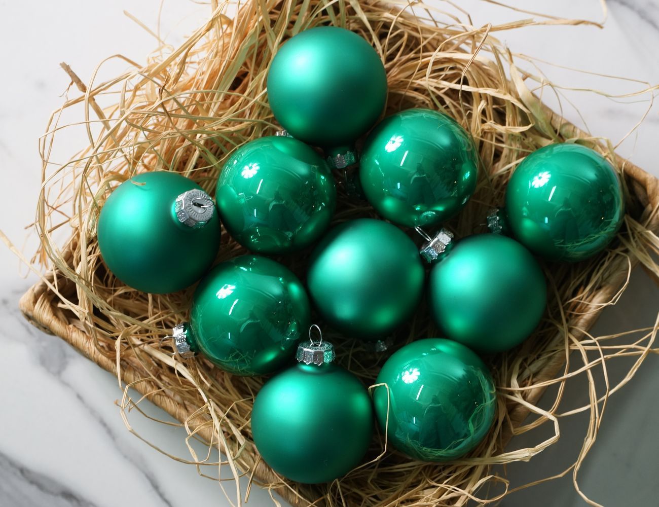 Однотонные шары приятного изумрудно-зелёного оттенка - идеальная база для украшения елки в любом стиле. Они могут стать и самостоятельным украшением, если их оформить ленточками или специальными бантами.