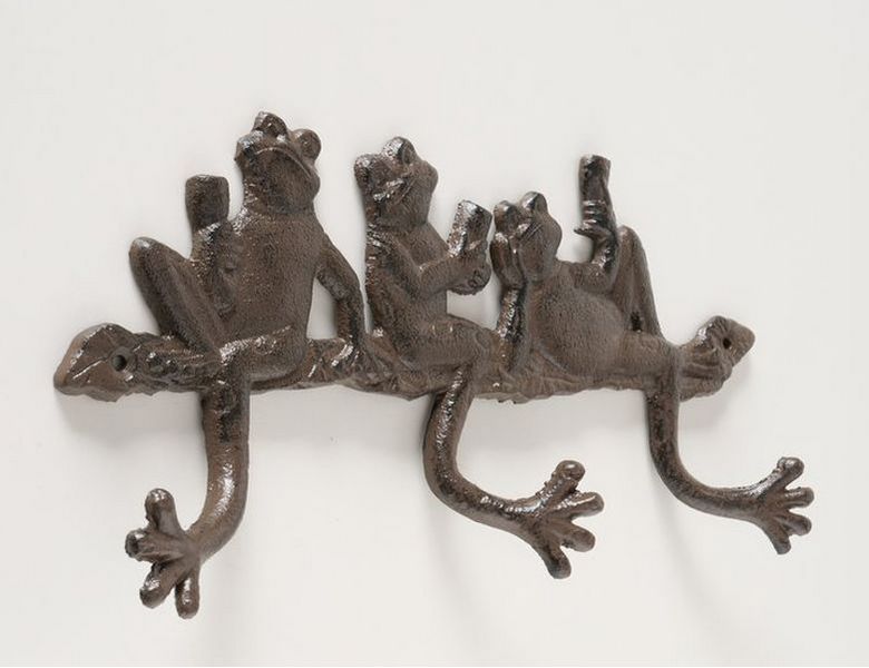 Традиция изготовления художественных изделий из чугуна насчитывает много десятилетий. Не забыта она и в наши дни, а поклонники таких интерьерных украшений отмечают не только их прочность, но и высокие эстетические качества. Настенная чугунная вешалка с тремя забавными лягушатами, чьи лапки станут крючками для вашей одежды, украсит прихожую или комнату и обязательно вызовет улыбки у всех, кто заглянет к вам в гости!