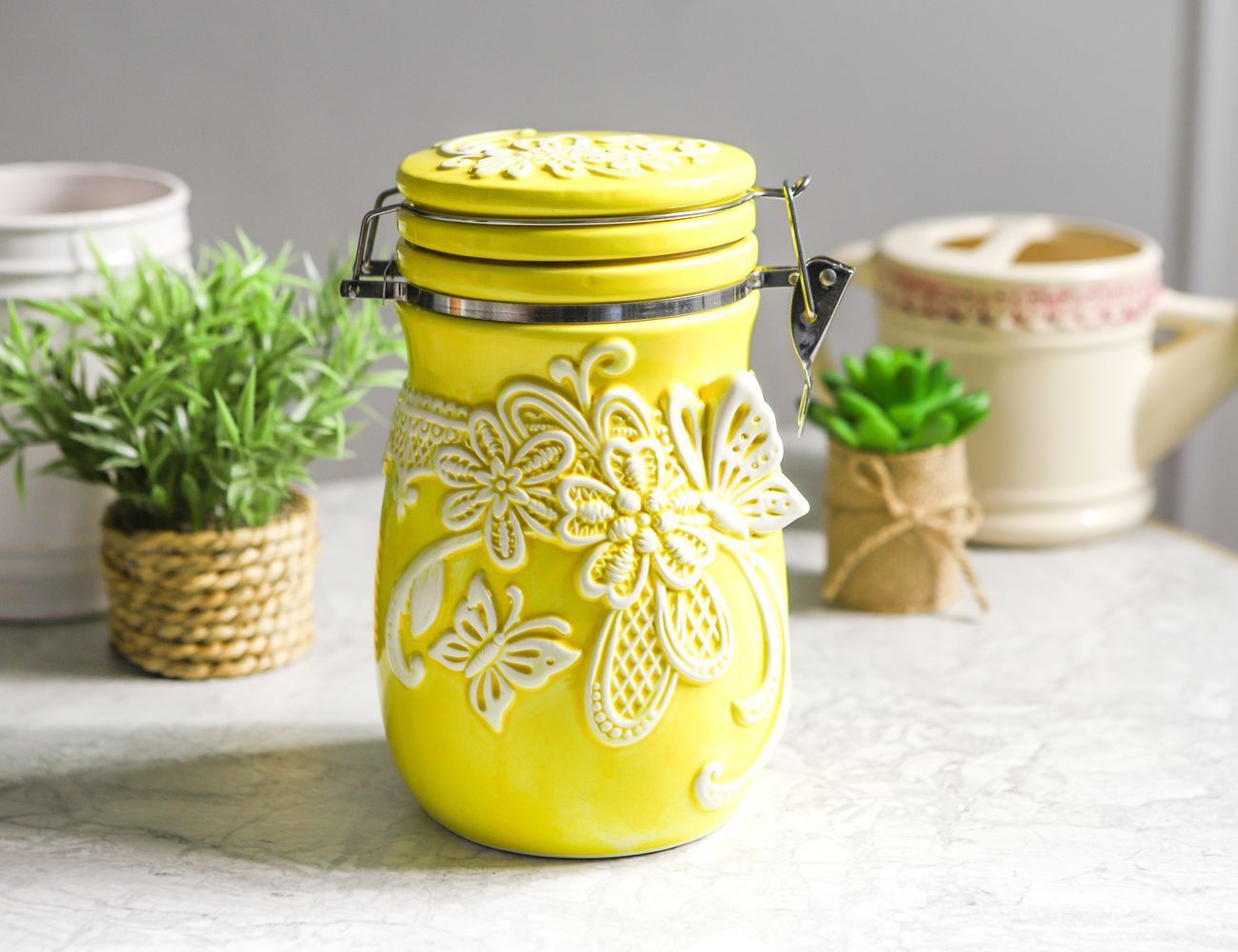 Ажурные цветы, порхающие красотки бабочки - летнее кружево, украшающее эту симпатичную жёлтую банку, всегда будет дарить вам солнечное настроение! И это тот случай, когда предмет - в данном случае ёмкость для хранения сыпучих продуктов - прекрасно сочетает в себе функциональность и весьма привлекательный внешний вид!