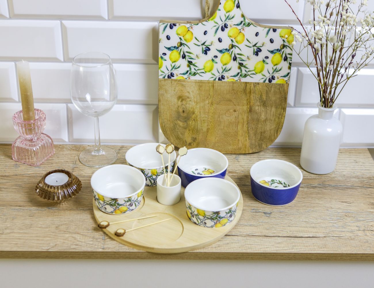 Порой бывает непросто подобрать посуду для подачи лёгких закусок к вину или ассорти соусов к горячему. Отличное решение - набор 'Сайпрус': стильно, удобно и практично. Больше никаких проблем: фарфоровые чаши, декорированные средиземноморскими мотивами и бамбуковый поднос для удобной подачи. Помидорки-черри и кубики сыра, маслины, орешки, чипсы, соусы - тут любые продукты будут смотреться аппетитно и привлекательно! В серии 'Сайпрус' вы найдёте и другие сервировочные предметы.