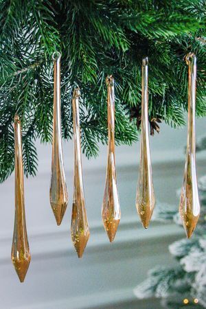 Согласитесь, украшения 'Сальме' из коллекции 'Золотой Лёд' формой очень напоминают сосульки, только вместо морозных узоров их украшает солнечный оттенок и золотистые искорки! Конечно, сосульки 'Сальме' можно традиционно определить на ёлку, а можно пофантазировать и украсить этими прекрасными подвесками портьеры или другие предметы вашего интерьера.