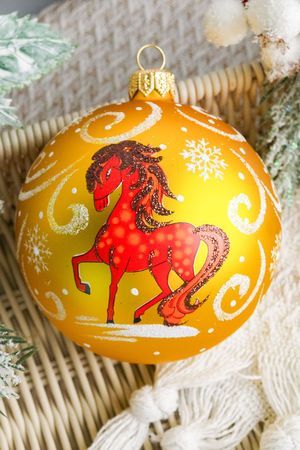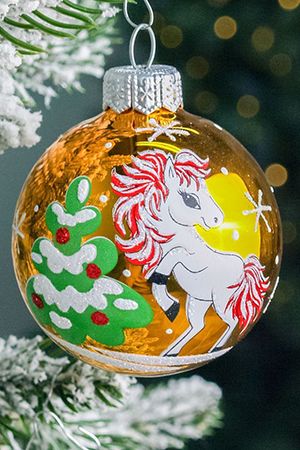 Красавец конь с празднично мерцающий гривой приглашает вас стремительно и энергично ворваться в наступающий год, обещая своё покровение! Этот нарядный голубой шар, без сомнений, станет отличным талисманом, оказавшись на вашей ёлке!