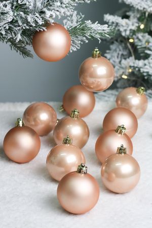 Набор из двенадцати пластиковых глянцевых и матовых шаров оттенка янтаря идеально подходит для создания базового фона ёлочного наряда!