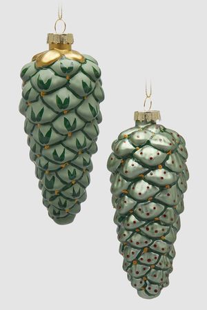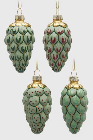 Невероятно красивый набор представляет самый подходящий и самый естественный для ёлочки аксессуар во всей красе: словно покрытые морозной вуалью и чуть тронутые золотом, четыре шишки мягкого изумрудного оттенка изящно и очень нежно подчеркнут очарование вашей новогодней ёлочки!