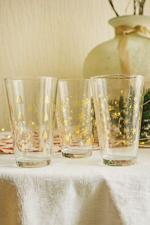 Особенные стаканы для особенного праздника! Они словно усыпаны золотистыми конфетти, да не простыми, а фигурными и чуточку волшебными - очаровательные снежинки, милые ёлочки и обаятельные звёздочки защекочут ваше настроение не хуже озорных пузырьков шампанского!