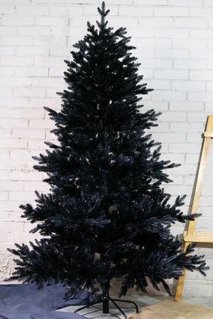 Характеристики: Высота: 185 см. Диаметр нижнего яруса: 124 см. Общее количество веток: 783 шт. Тип хвои: литая 100% - полностью имитирует натуральные иголки. Цвет хвои: чёрный. Подставка: металлическая. Ель упакована в плотную картонную коробку. Основания веток, ствол и подставка металлические.