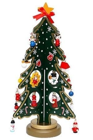 Характеристики: Размер - 18.5х18.5х29 см. Материал - дерево. Цвет - зелёный. В комплекте - ёлочка, 23 игрушки.
