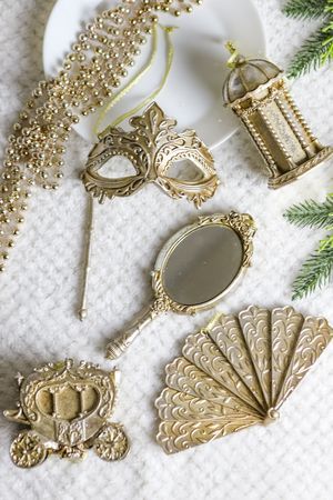 Великолепные маски - обязательный атрибут венецианских карнавалов. Искусству изготовления масок уже не одна сотня лет, а маска Вольто, пожалуй, самая народная, ведь это именно её в специально разрешённые дни носили обычные горожане. Для участия в карнавале Вольто крепили на голове лентами, а для эту великолепную маску, украшенную позументом и блёстками, вы легко закрепите на ёлочке с помощью золотистого шнурка.