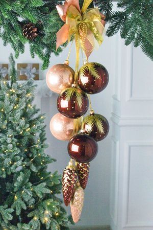 Изумительно-нарядная гилянда из трех золотистых шаров, и шести шишек. Гирлянду украшает роскошный искрящийся бант и изящная веточка из искусственной хвои.