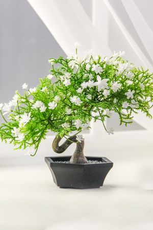 Этот очаровательный кустик, усыпанный белыми цветочками, формой чуть напоминает бонсай. Настоящий цветущий бонсай - это очень красиво, но процесс его выращивания долгий и трудоёмкий. Да и ухода он требует тщательного. А вот этот чудесный экземпляр не доставит вам никаких хлопот и всегда будет радовать своим свежим видом!