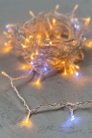 Характеристики: Длина - 3 х10 м (всего 30 м); Расстояние между лампочками - 10 см; Количество LED-ламп (светодиодов) - 300; Основной цвет ламп - желтый; Мерцание - каждый 5 LED холодным белым цветом; Цвет провода: прозрачный PVC; Напряжение: 24V, трансформатор входит в комплект. Степень влагозащиты: IP44 (подходит для использования в помещении и на улице в местах, защищенных от прямого воздействия струй воды, например, под козырьками и навесами)