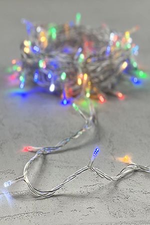Характеристики: Количество LED-ламп: 100; Цвет лампочек: разноцветный Гирлянда - мерцающая, каждый 5-й диод мерцает холодным белым Мощность: 4,9 Вт; Напряжение: 24V; Длина провода: 10 м; Гирлянда имеет коннектор, позволяющий соединять до 10 электрогирлянд; Провод: прозрачный PVC; Степень влагозащиты: IP44 (подходит для использования в помещении и на улице в местах, защищенных от прямого воздействия струй воды, например, под козырьками и навесами)в в условиях высокой влажности;