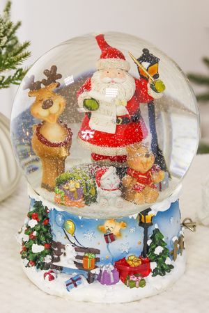 Характеристики: Размер - 14.5х10.5 см. Диаметр шара - 10 см. Материал - стекло, полистоун. Музыка - 'We wish you a merry Christmas'. Работает от батареек (в комплект не входят).
