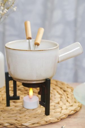 Мы так редко балуем себя и тех, кого любим! Но почему бы не сделать праздничное исключение и не приготовить удивительный десерт - шоколадное фондю? Для этого не потребуется специальных знаний: просто положите кусочки шоколада в чашу, зажгите внутри подставочки свечу, подождите, пока шоколад расплавится и начинайте обмакивать в него ягоды, кусочки фруктов или бисквита, накалывая их входящей в набор вилочкой - настоящее наслаждение для сладкоежек!