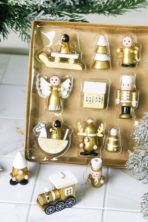 Характеристики: В наборе: 12 шт. Размер игрушек: 2-4 см. Материал: дерево. Цвет: золотой с белый. Тип крепления: подвеска.