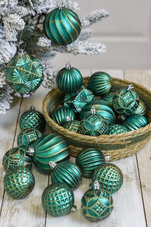 Характеристики: В наборе: 26 шт. В набор входит: 4 шара 10 см, 15 шаров 8 см и 7 шаров 6 см. Материал: пластик. Цвет: зеленый бархат.