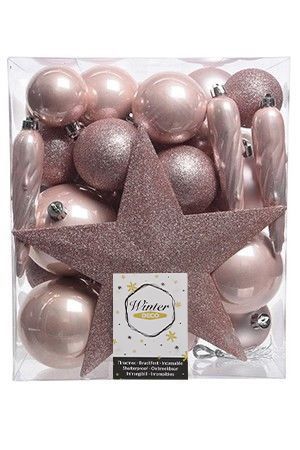 Характеристики: Количество - 31 украшение. Материал - пластик. Цвета - жемчужно-розовый. Шары: 5 см - 9 шт. 6 см - 8 шт. 8 см - 6 шт. Сосульки - 12 см (8 шт.). Упаковка - прозрачная пластиковая коробка.