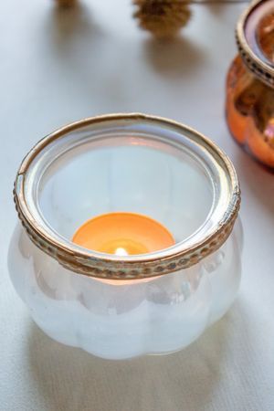 Характеристики: Размер: 6.5 см. Материал: стекло, текстиль. Свеча, представленная на фото, в комплект не входит.