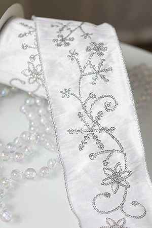 Декоративная лента 'Серебряная зима' с армированным краем, позволяющим зафиксировать любую созданную форму - великолепный предмет для творчества: с её помощью можно изысканно оформить подарок или букет, а можно своими руками изготовить разнообразные банты и розы для украшения ёлочки или декорирования интерьера. А подспорьем в этом послужит роскошная вышивка серебристыми листочками по полотну ленты. Фантазируйте и творите!