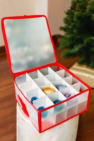 Ёлочные игрушки будут чувствовать себя в полной безопасности, ожидая в этой удобной коробке с картонными разделителями наступления следующего праздника!