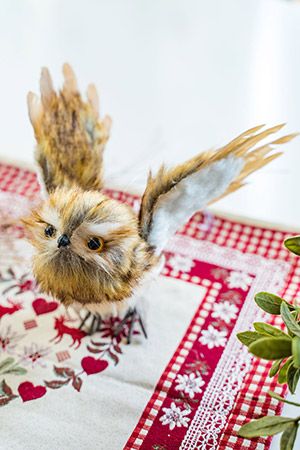 Надо полагать, что сова Варпу пожаловала к нам из новогодней сказки - где ещё она могла бы обзавестись такой кружевной грудкой, где нашла бы россыпь сияющих блёсток, украшающих её крылышки? Конечно, как и положено сказочной сове, Варпу любит праздники и с радостью проведёт их, сидя возле ёлочки, но скорее всего, вы не захотите расстаться с ней и с наступлением тепла, ведь такая красотка может переселиться на полочку или на окошко и радовать своим видом круглый год!