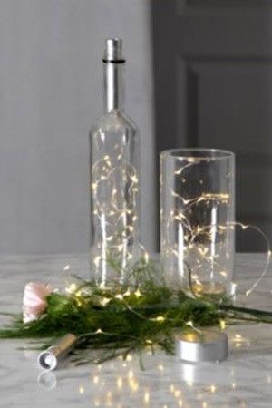 Бутылки с заманчивыми огоньками-светлячками внутри очень стильно смотрятся в интерьере и, благодаря этой особенной гирлянде из крошечных ярких звёздочек, вы сможете сами сделать такие оригинальные светильники, ведь батарейки в ней располагаются не в обычном коробе, а в удобной пробке!