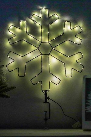 Порой, как ненужно лишних слов, так ненужно и лишних деталей! Лаконичный силуэт на стене дома - белая снежинка, на которой расположились 104 крохотных тёплых огонька-росинки… Тонкий образ и изящный символ зимней сказки, а не просто светящееся украшение для дачи и сада!