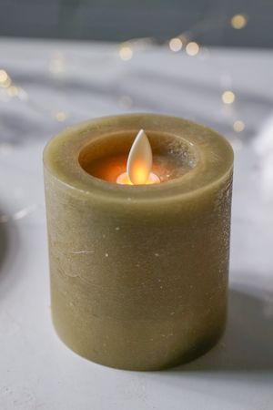 Характеристики: Размер: 7.5*7.5 см. Материал: воск. Цвет свечи: оливковый. Цвет лампочки: теплый белый. Эффект 'живого пламени' - колышущийся язычок, мерцающее пламя. Работает от батареек. Для использования только в помещении.