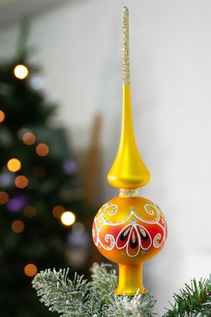 Елочная верхушка из стекла с ручной росписью. Верхушка поставляется в индивидуальной упаковке. Высота 275-280 мм. Цвет - золотой. Материал: стекло.