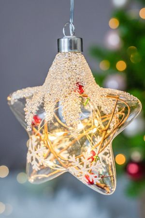 Совершенно очаровательная звездочка с сюрпризом - внутри нее так чудесно расположились причудливые хрупкие веточки, глянцевые ягоды и целая россыпь ледяной росы! И вся эта милая праздничная композиция смотрится еще волшебнее вечером, когда загораются теплые огоньки-росинки!